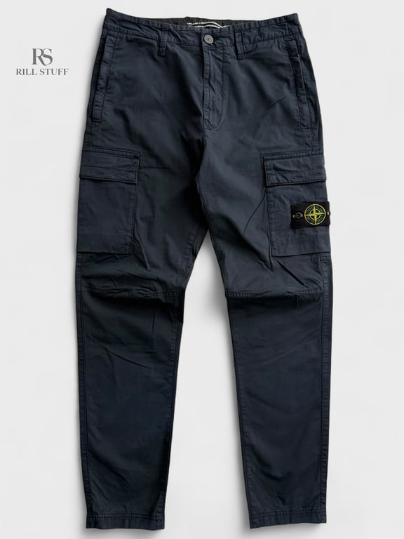 Брюки Stone Island из эластичного хлопка темно-синего цвета. Изделие украшено культовой съемной нашивкой с логотипом Compass, имеет низкую посадку, шлевки для ремня, а также потайную застежку на пуговицы и ширинку. Два наклонных боковых кармана, задний прорезной карман, два боковых кармана-карго и облегающий крой.
